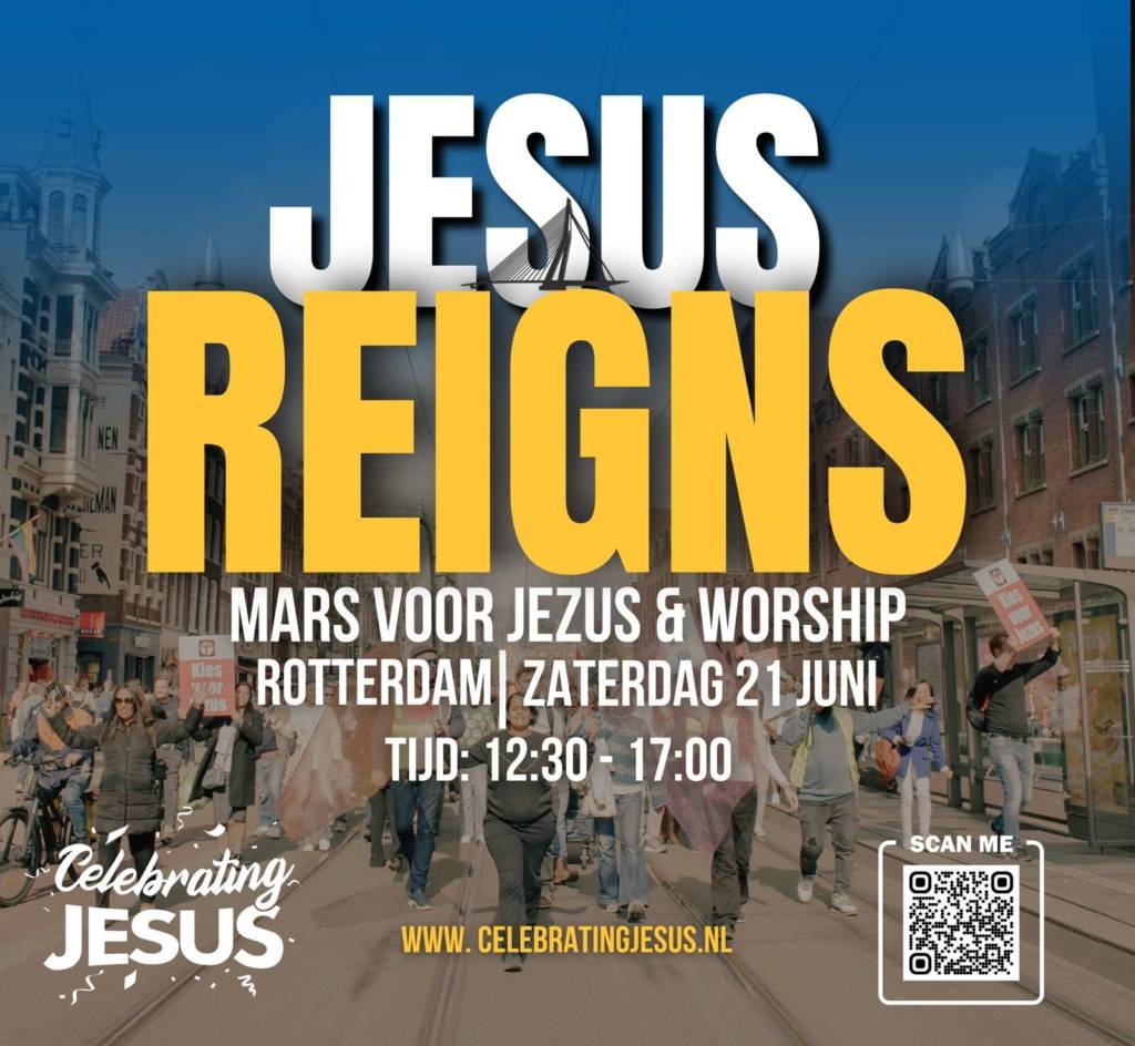 Celebrating Jesus in samenwerking met de Voorgangers Overleg Rotterdam, organiseert op 21 juni 2025 een ‘Mars voor Jezus’ in Rotterdam. Het doel van deze mars is de gezamenlijke liefde voor Jezus Christus te tonen en te bidden voor de stad, de leiders en voor geestelijke vernieuwing in ons land.