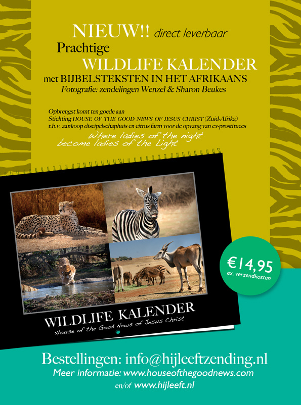 Dit jaar hebben de twee zendelingen een prachtige full-color ‘Wild Life’ verjaardagskalender uitgebracht. Beiden hebben een professionele achtergrond op het gebied van film en fotografie. De opbrengst hiervan zal geheel toekomen aan het discipelschapshuis. Deze is nog steeds verkrijgbaar in de boekenwinkel in onze gemeente.